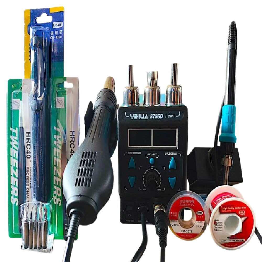Estacion de Calor compacta 2 en 1 con Doble Pantalla LCD de 3 dígitos para indicar temperatura de la pistola y el cautin, control de temperatura de la pistola y del cautin digital, control de aire analogo, aire frio y caliente, compresor de aire externo con rápido calentamiento.